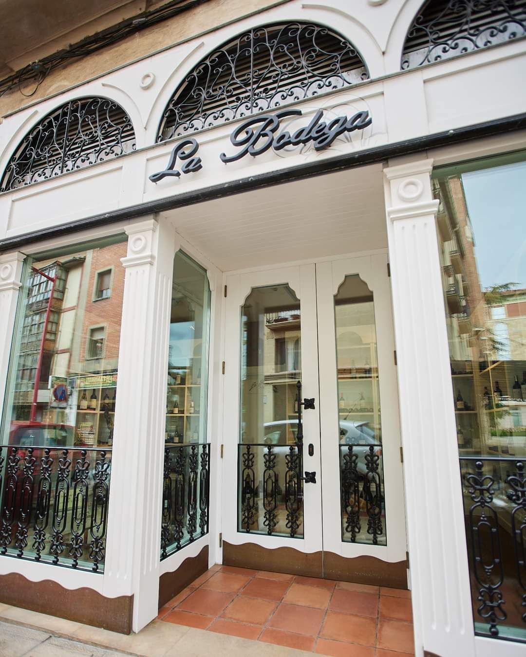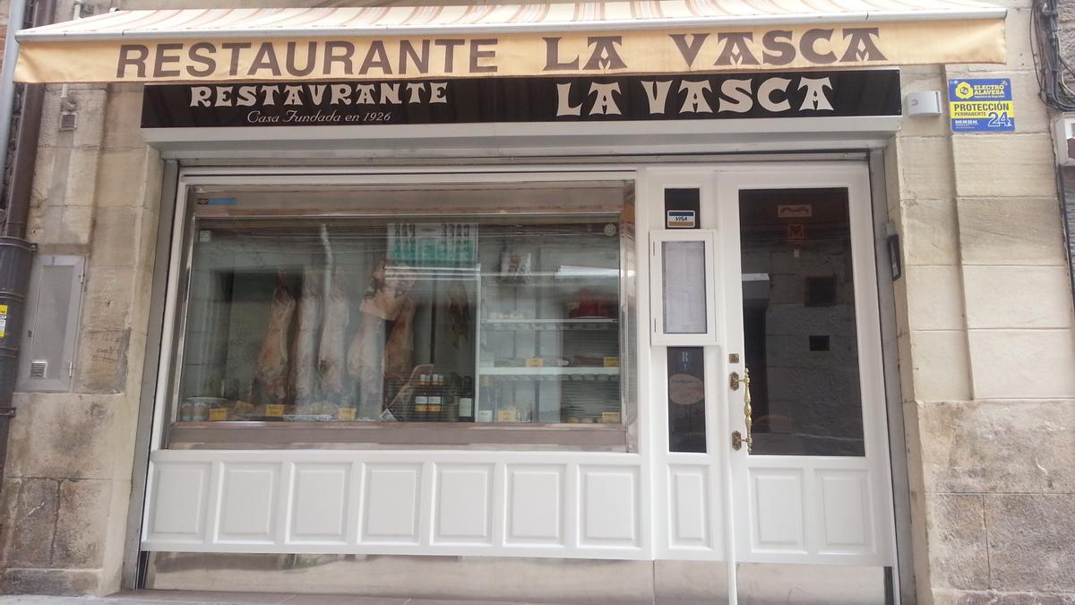 📸 Detalle de la entrada al restaurante, con su típico escaparate, en un edificio del siglo XIX. La Vasca