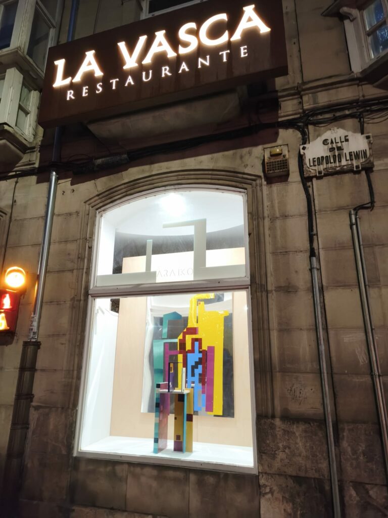 Que sea precisamente Araiko quien firme la obra del escaparate de La Vasca refuerza la conexión entre el restaurante y esa nueva piel artística de Miranda: los mismos colores que empiezan a poblar muros y plazas ahora dan la bienvenida a quienes se acercan a celebrar el centenario alrededor de una buena mesa.
